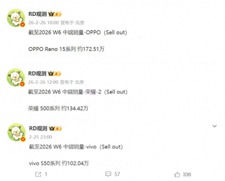 因此今天给全球分析一下OPPO Reno15系列、vivo S50系列以及荣耀500系列的最新销量,来自行业东说念主士“RD不雅测”的最新数据显现,截止2026年W7周也便是2月15日,OPPO Reno15系列的累计销量达到172.51万台;vivo S50系列的累计销量达到102.04万台;荣耀500系列的累计销量达到134.42万台。固然了全球不要毛糙地去对比累计销量,因为这三款机型的商用时候澈底不同样,当今是谁商用的最早谁的销量就高,是以底下给全球分析一下在W7周这几款机型各自卖出了若干。