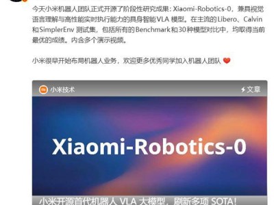 小米机器东谈主团队当天晓喻,细致发布并开源全新具身智能VLA模子——Xiaomi-Robotics-0,其真机运转画面同步公开。这一效劳记号着小米在机器东谈主领域已矣要津突破,以47亿参数规模、视觉言语剖释与高性能及时实行才调的纠合,在三大主流仿真测试中全面迥殊行业标杆,斩获全项SOTA(面前起程点进水平),并在确凿机器东谈主上已矣畅达看成实行。