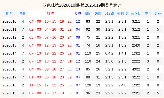 当期红球号码跨度为23,质合比为2:4,012路比为2:2:2,邻孤传比为2:2:2。蓝球开出小奇数01。
